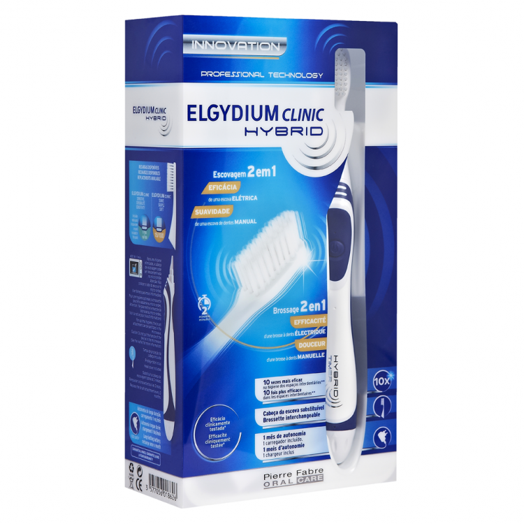 ELGYDIUM Clinic HYBRID Resulta da fusão da eficácia de uma escova de dentes elétrica com o design e suavidade de uma escova de dentes manual. As vibrações sonica otimizam a eficácia da escova.