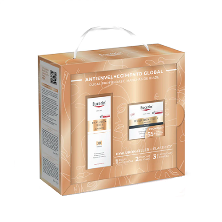 Eucerin Hyaluron-Filler+Elasticity Global Anti-Aging Coffret é o coffret perfeito para combater rugas profundas e manchas da idade e hidratar e redensificar profundamente a pele. Contém: Eucerin Hyaluron-Filler Elasticity Sérum 3D 30ml + Hyaluron-Filler Elasticity Creme de Noite 20ml, com o ativo despigmentante patenteado Thiamidol e Ácido Hialurónico.
