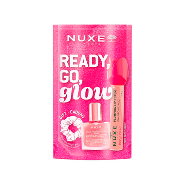 Nuxe Ready Go Glow Pack contém: Nuxe Very Rose Plumping Lip Sérum de textura leve e fórmula com 98% de ingredientes naturais Contém ácido hialurónico natural, que redensifica e hidrata os lábios Extrato oleoso de rosa, que suaviza os lábios Combinação de pimenta e mentol, que confere volume Nuxe Huile Prodigieuse Or Florale é um cuidado nutritivo reinventado com 96% de ingredientes de origem natural Contém 7 óleos vegetais preciosos (tsubaki, borragem, hipericão, amêndoas doces, camélia, avelã e macadâmia) para uma ação nutritiva intensa Fórmulas vegan. Dermatologicamente testados.
