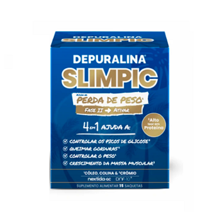 Depuralina Slimpic é um suplemento alimentar em pó desenvolvido para apoiar o controlo de peso e o metabolismo das gorduras. Cada saqueta combina ingredientes ativos reconhecidos, como chá verde, L-carnitina, fibra e extratos vegetais, que atuam em sinergia para favorecer a queima de gordura e a eliminação de toxinas. Com um formato prático de saquetas individuais (15 x 6,6g), é fácil de transportar e usar no dia a dia - basta diluir em água Ideal como complemento de um estilo de vida saudável, com alimentação equilibrada e exercício físico regular Sem glúten. Sem açúcares adicionados.
