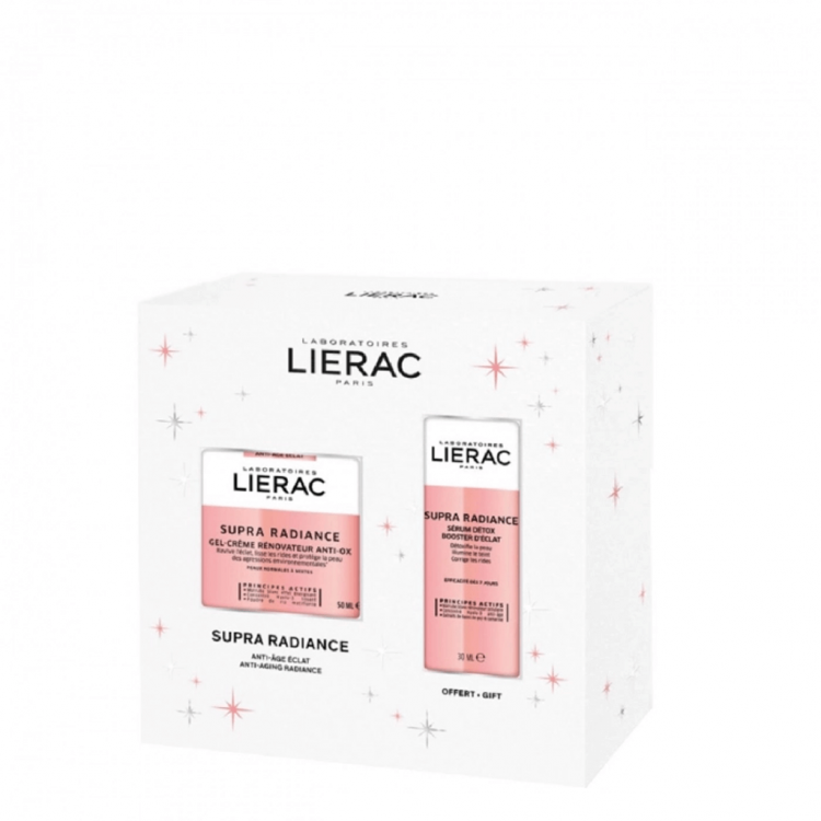 Lierac Supra Radiance Coffret Anti-Envelhecimento contém: Lierac Supra Radiance Gel Creme Renovador Anti-Ox com uma combinação de extrato de marroio-branco, concentrado Hyalu-3, extrato de acácia-do-japão, pigmentos soft focus e pó de arroz Para uma ação detox, anti-envelhecimento, alisante, redensificante e matificante Ideal para pele normal a mista Lierac Supra Radiance Sérum Detox Iluminador com uma combinação de extrato marroio-branco, pigmentos soft focus e pó de arroz Para uma ação detox, alisante, redensificante, estimulante e iluminadora